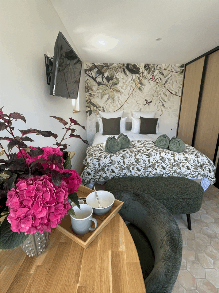 • 1 coffre, une table en bois et 2 fauteuils arrondis verts foncés en tissu, et un plateau en bois.